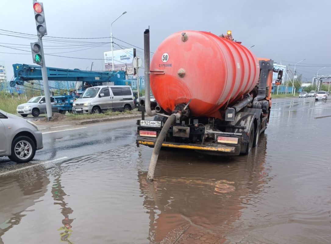 В связи с продолжающимся проливным дождем в Якутске силами техники МУП «Жилкомсервис» проводится откачка воды с заниженных мест улиц и внутриквартальных территорий.