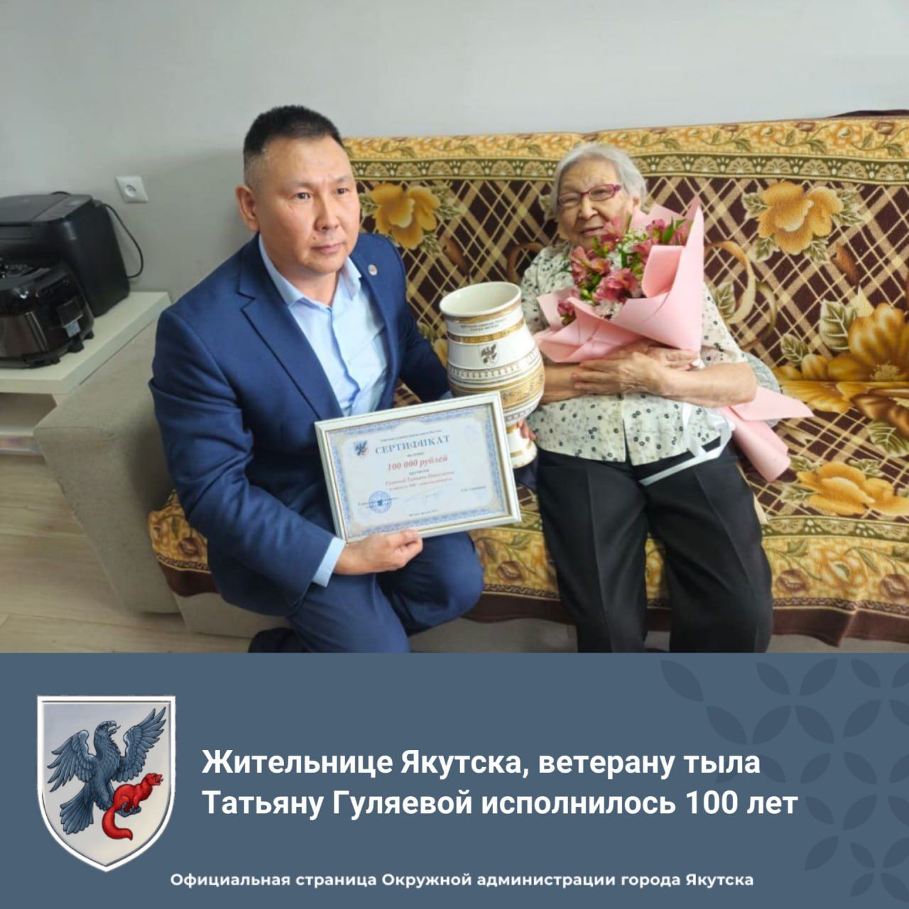 Юбилейный вековой день рождения отметила 18 августа почетный ветеран Российской Федерации Татьяна Николаевна Гуляева. В этот радостный день долгожительницу поздравил заместитель главы города Якутска Юрий Петров.
