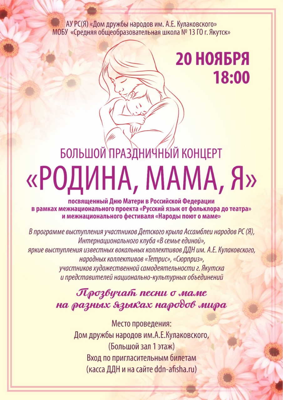 20 ноября 2025 г. в 18 часов Дом дружбы народов им. А.Е. Кулаковского приглашает на БОЛЬШОЙ ПРАЗДНИЧНЫЙ КОНЦЕРТ «РОДИНА, МАМА, Я», посвященный Дню Матери в Российской Федерации, проводимый в рамках межнационального проекта «Русский язык от фольклора до театра» и межнационального фестиваля «Народы поют о маме».