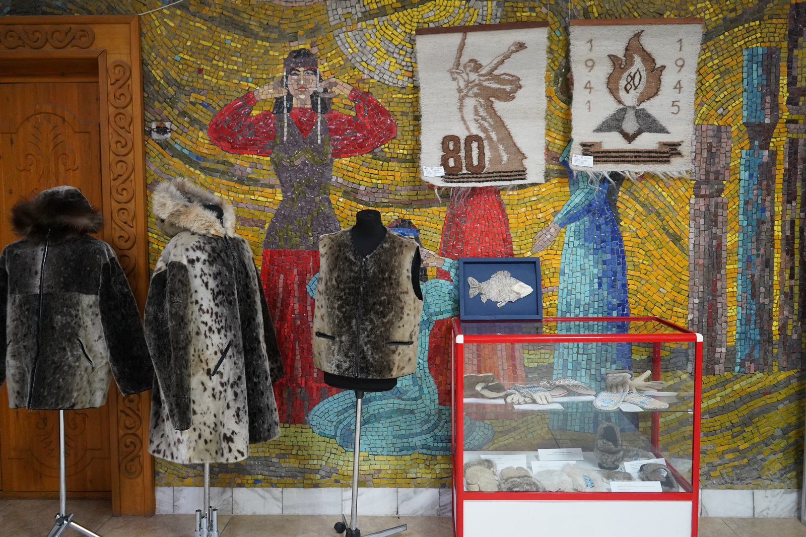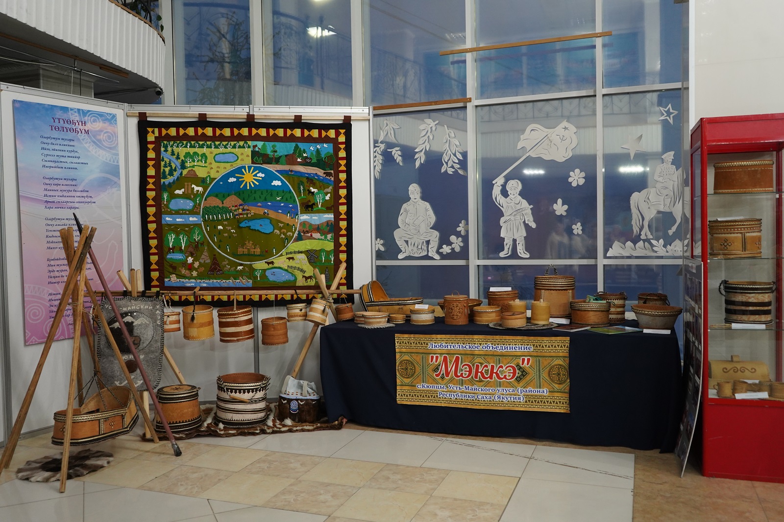 Значительную экспозицию представила делегация Кюпского наслега Усть-Майского района в рамках фестиваля эвенкийской культуры «Күлүмнүүр Күп күнэ», посвященного 85-летию наслега. Выставка включает несколько блоков: Творческое объединение «Мэккэ» представляет утварь из бересты, работы по национальному шитью, картины художника Дьячковского Егора Степановича.