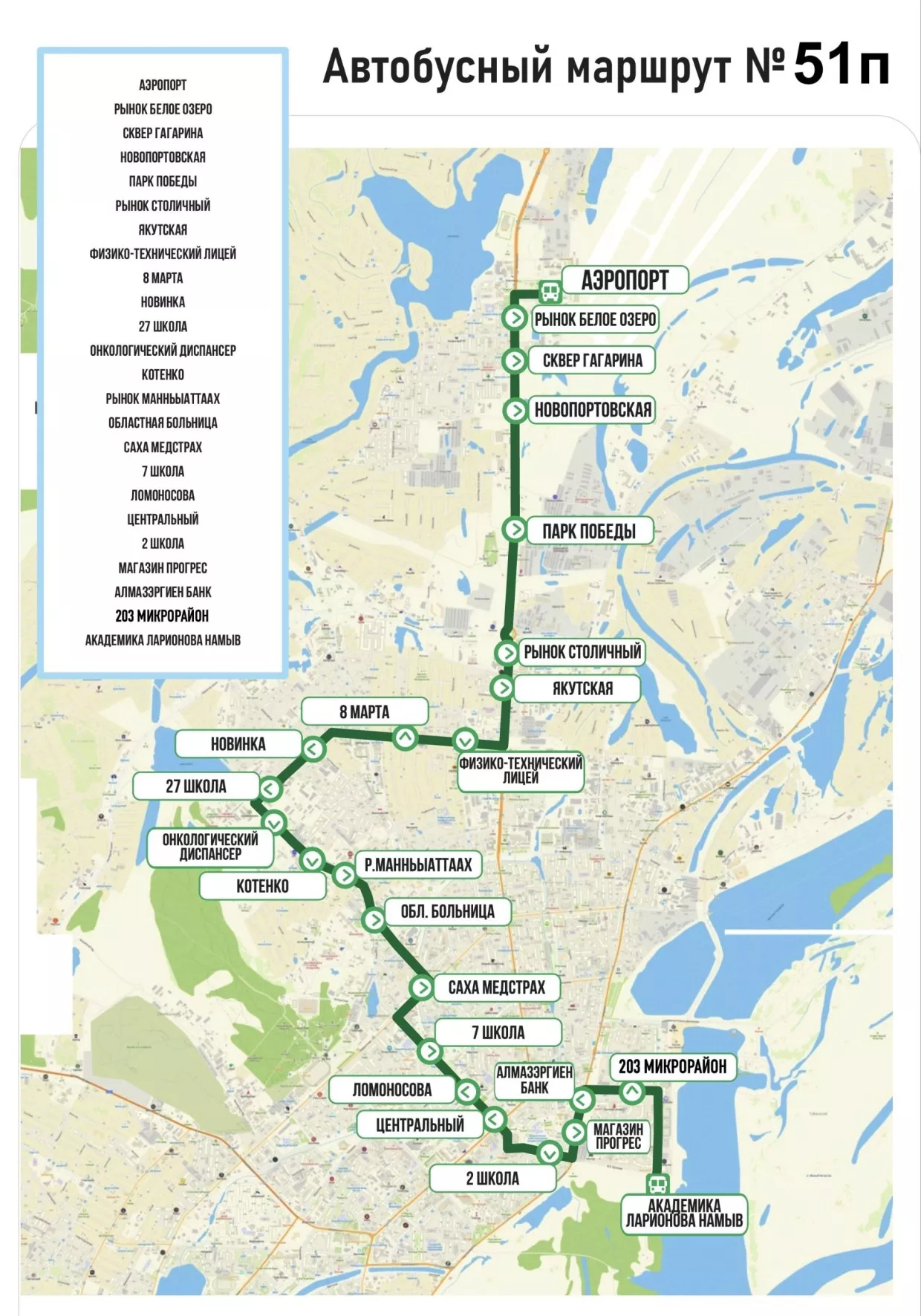 С 16 декабря в Якутске начал работу новый подвозной автобусный маршрут №51п, связывающий аэропорт с микрорайоном Намыв (203-й микрорайон). Об этом сообщил мэр города Евгений Григорьев в своем тгк @EvgenyGrigorev/