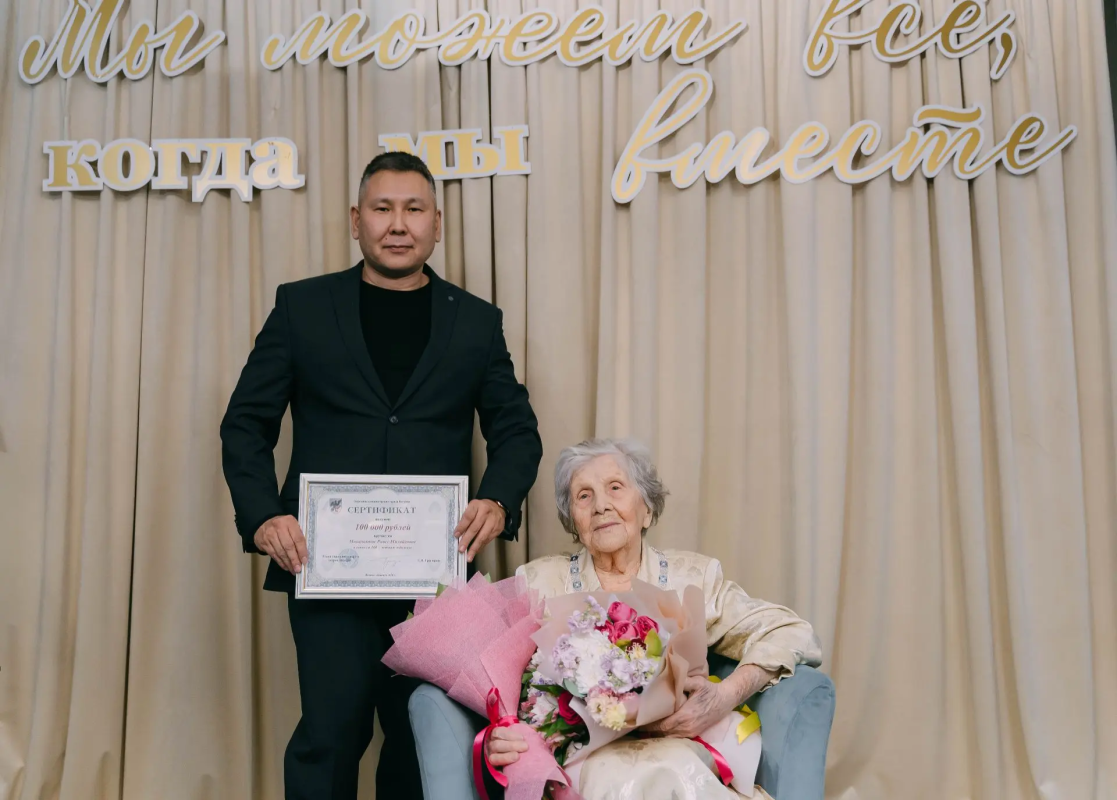 Юбиляру вручили почетный знак долгожителя Якутии «Үйэ саас» и 100 тысяч рублей от Окружной администрации города Якутска.