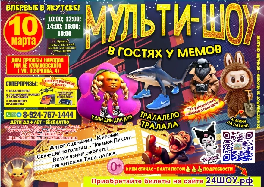 В нашем шоу переполох! К нам приехали звезды итальянских мемов! Зубастый Тралалело Тралала перепугал Гигантского Пикачу, и он скачет по головам зрителей. Шпиониро Голубиро пытается отыскать засланного казачка в зале. Мощный Удин Дин Дин Дун не знает русского языка и не понимает что происходит. Агарини Ла Патини все время мешается и лезет не туда. Милашка Куроми безудержно танцует, а огромный пушистый Лабубу принес с собой гигантскую Таба-Лапку! Невероятный Саб-Зиро и прекрасная Принцесса Китана уверенно пытаются навести порядок на шоу! Мистический незнакомец не только читает мысли зрителей, но и запускает летающих миньонов, которые летают над головами, кто поймал - его себе забрал!