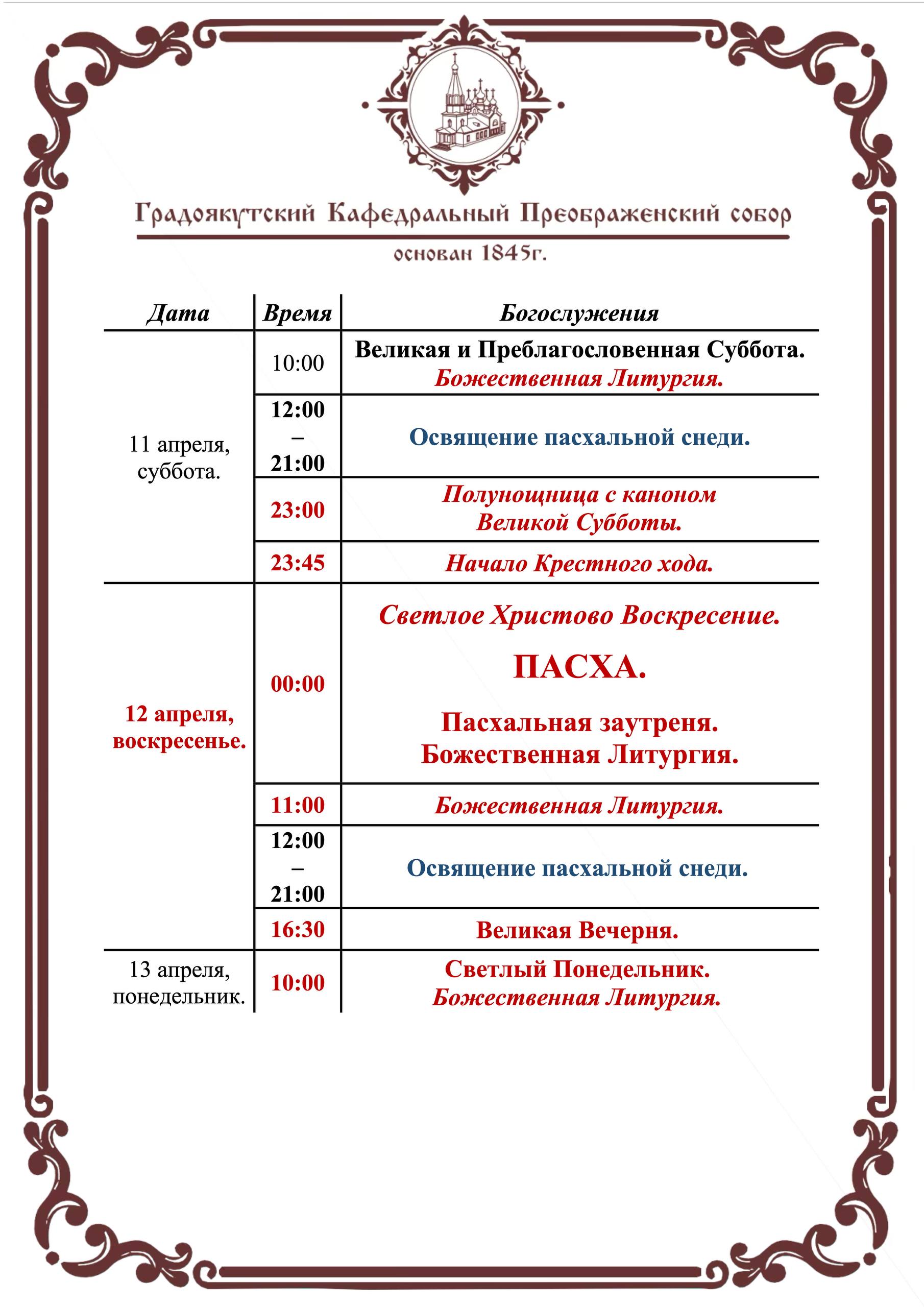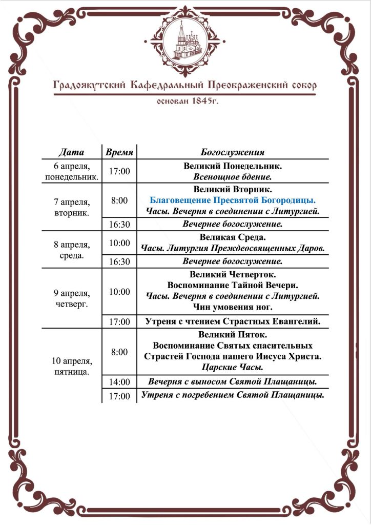 Богослужения в Преображенском соборе с 7 по 12 апреля