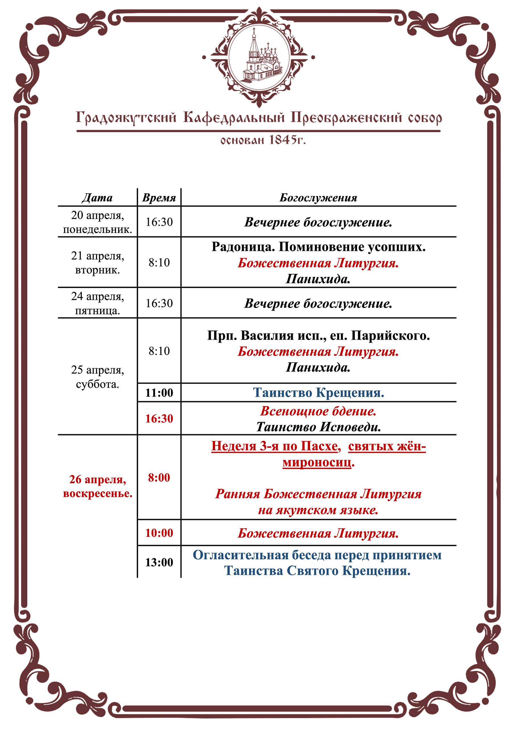 Богослужения в Преображенском соборе с 22 по 26 апреля