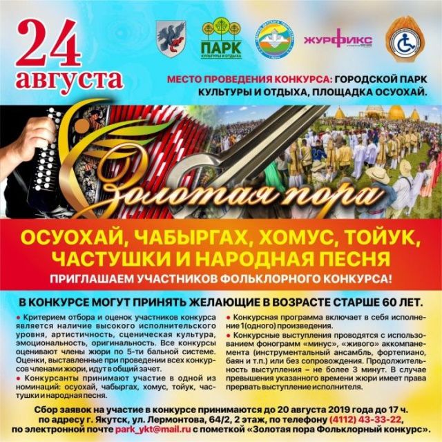 Сбор заявок на участие в конкурсе принимаются до 20 августа 2019 года до 17 часов по адресу г. Якутск, ул. Лермонтова, 64/2, 2 этаж, по телефону (4112) 43-33-22, по электронной почте park_ykt@mail.ru c пометкой «Золотая пора Фольклорный конкурс».