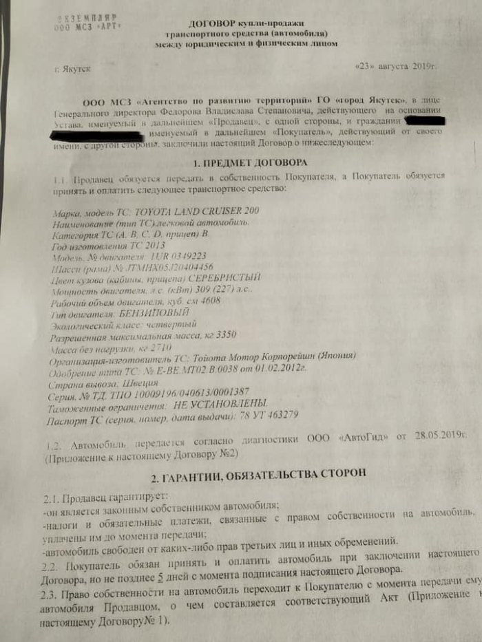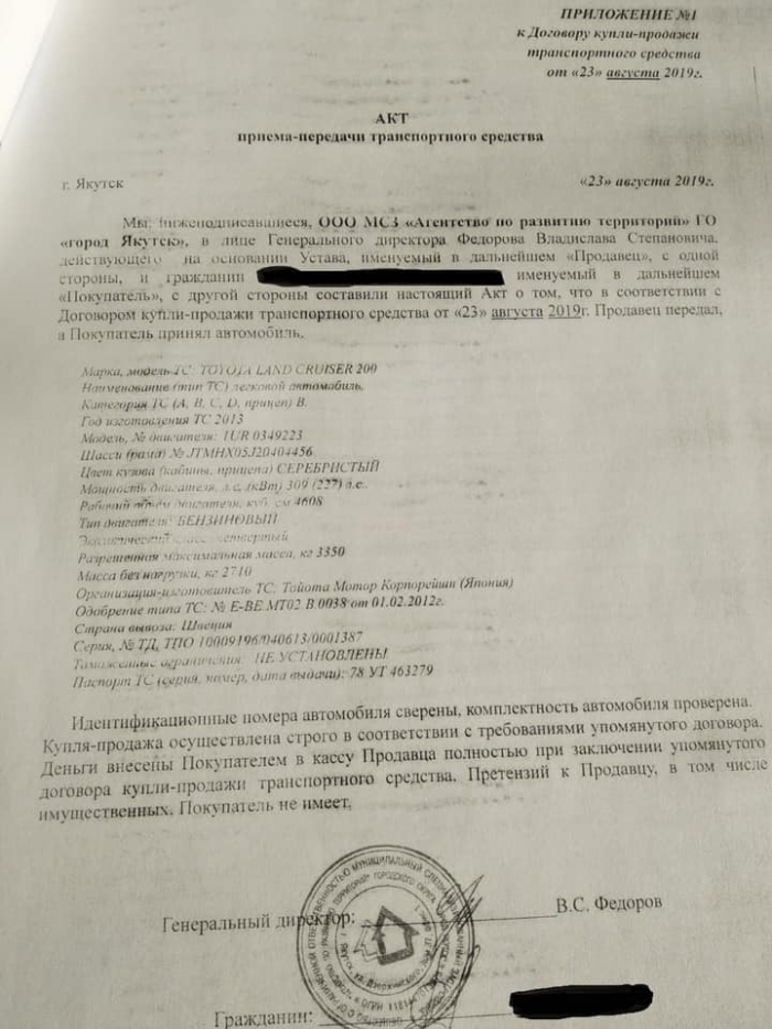 Информирую, что указанный автомобиль, стоявший на балансе ООО МСЗ «Агентство по развитию территорий», продан 23 августа 2019 года. Внедорожник реализован за 1,8 млн рублей, значительно дороже объявленной начальной стартовой цены отмененного аукциона (1 582 700 рублей), о чем свидетельствует соответствующий договор купли-продажи между указанным юридическим лицом и гражданином Я-ым. Средства поступили на расчетный счет предприятия.