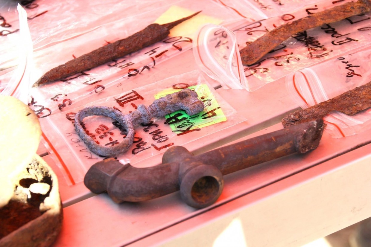 Печные дверцы с рисунком звезды и надписью «Якутск», ножка от швейной машинки «Зингер», фрагменты традиционной якутской керамики XVIII века, якутского деревянного «вечного» календаря, предметы личной гигиены – зубные щетки, гребешок, лопаточки для чистки ногтей, бутылочки от французской парфюмерии, рыболовные грузы-кебасы, нож, сделанный в немецком городе Золинген, монеты разных лет, в том числе 5-копеечная монета 1772 года, монетка-чешуйка с надписью «Царь Петр Алексеевич», выпуск которой датируется периодом до реформ Петра Первого, знак в виде венка, который вручали до 1859 года, и другие находки археологов впечатлили участников мероприятия.