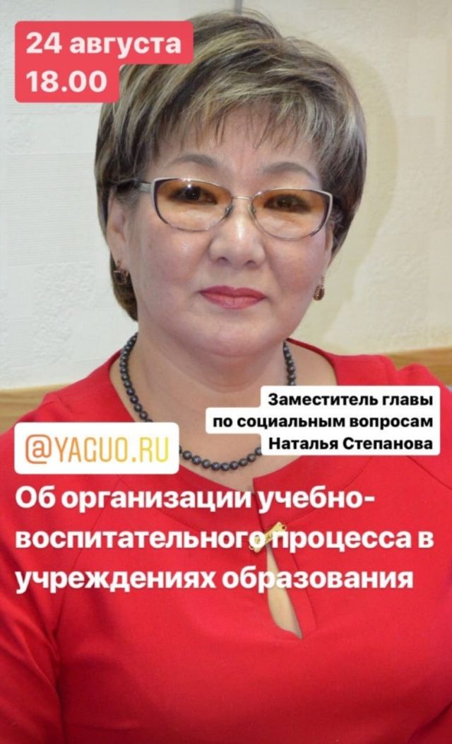 Сегодня, 24 августа, заместитель главы города Якутска Наталья Степанова проведет прямой эфир в аккаунте управления образования г. Якутска @yaguo.ru в соцсети Instagram, ответит на вопросы горожан.