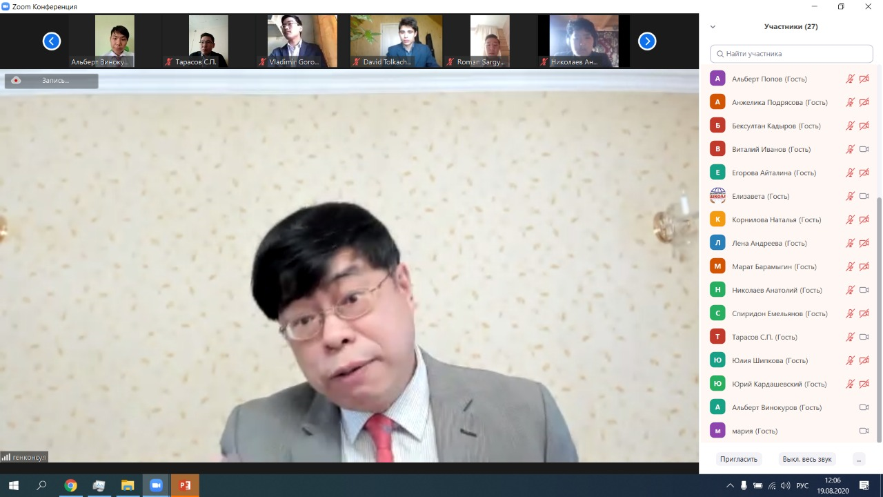 19 августа состоялась встреча с Генеральным консулом Китайской Народной Республики в Хабаровске господином Цуй Годзе. Господин Цуй Годзе принимает участие в Летней дипломатической школе во второй раз. В прошлом году 2 июля 2019 года в стенах Дворца детского творчества города Якутска состоялась встреча юных дипломатов с делегацией Генерального консульства Китайской Народной Республики в г. Хабаровске.