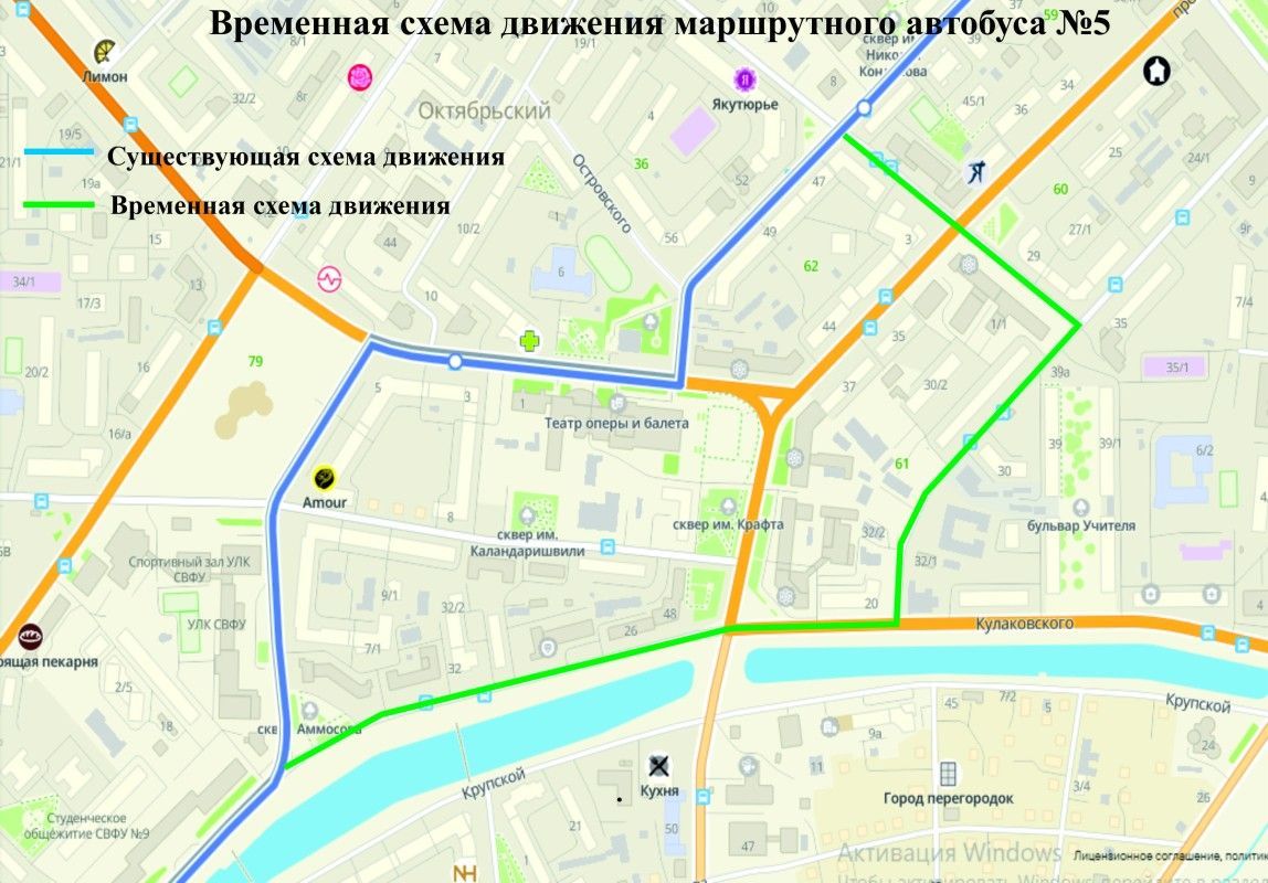 Окружная администрация города Якутска сообщает, что с 9 апреля 2023 года городской маршрутный автобус №5 будет следовать по временному измененному маршруту: с конечной остановки «Медцентр» по улицам: Сергеляхское шоссе - Дежнева - Кулаковского – Ярославского – Октябрьская -Орджоникидзе - Петра Алексеева - Семена Данилова – Космонавтов –Пионерская - Жорницкого - Хатын-Юряхское шоссе - Курнатовского - Можайского - Строда - Советская - Мархинская - до конечной остановки «Малая Марха».