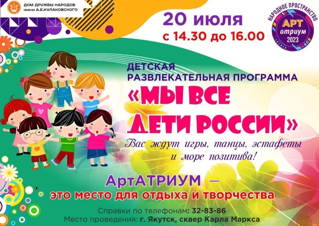 Дом дружбы народов им. А.Е. Кулаковского 20 июля с 14:30 до 16 часов приглашает на площадку «АртАтриум», где состоится детская развлекательная программа «Мы все дети России».