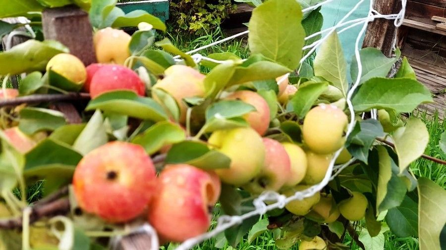 Пришлось даже смастерить гамак для плодов, чтобы ветки не подломились под их тяжестью. В прошлом году деревца тоже цвели, но не опылялись - и хорошо: теперь они набрали силу. Яблоньки эти растут как стланик, стелются по земле.