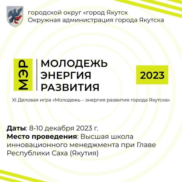 XI Деловая игра «Молодежь – энергия развития города Якутска» (МЭР) пройдет с 8 по 10 декабря 2023 года на базе Высшей школы инновационного менеджмента при Главе Республики Саха (Якутия) по адресу: город Якутск, проспект Ленина, 1.