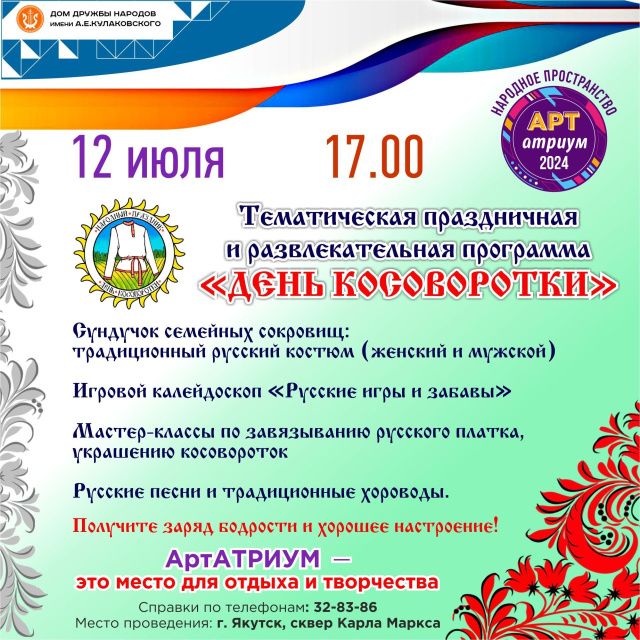 Основная цель мероприятия во Всероссийский День косоворотки — воспитание интереса и любви к русской национальной культуре, народному творчеству, обычаям, традициям. Участники узнают об истории возникновения косоворотки на Руси с 12 века. Услышат много интересного о традиционном русском костюме (женском и мужском), что подчеркнет важность уважения традиций и обычаев своего народа. Состоятся мастер-классы по завязыванию русского платка, украшению косовороток. Зрителям будут предложены косоворотки, которые они смогут примерить на себя и принять участие в народных русских играх и забавах. Будут звучать красивые русские песни и исполняться традиционные хороводы.