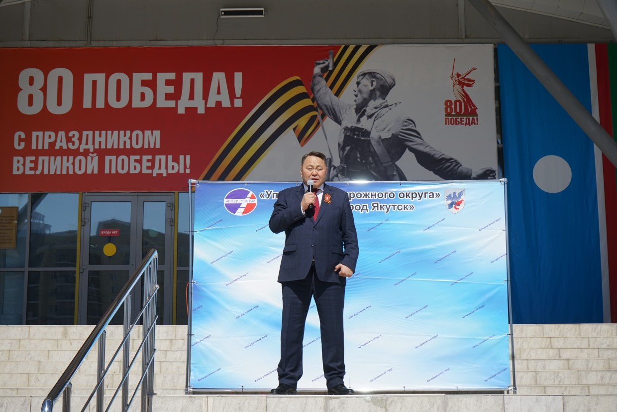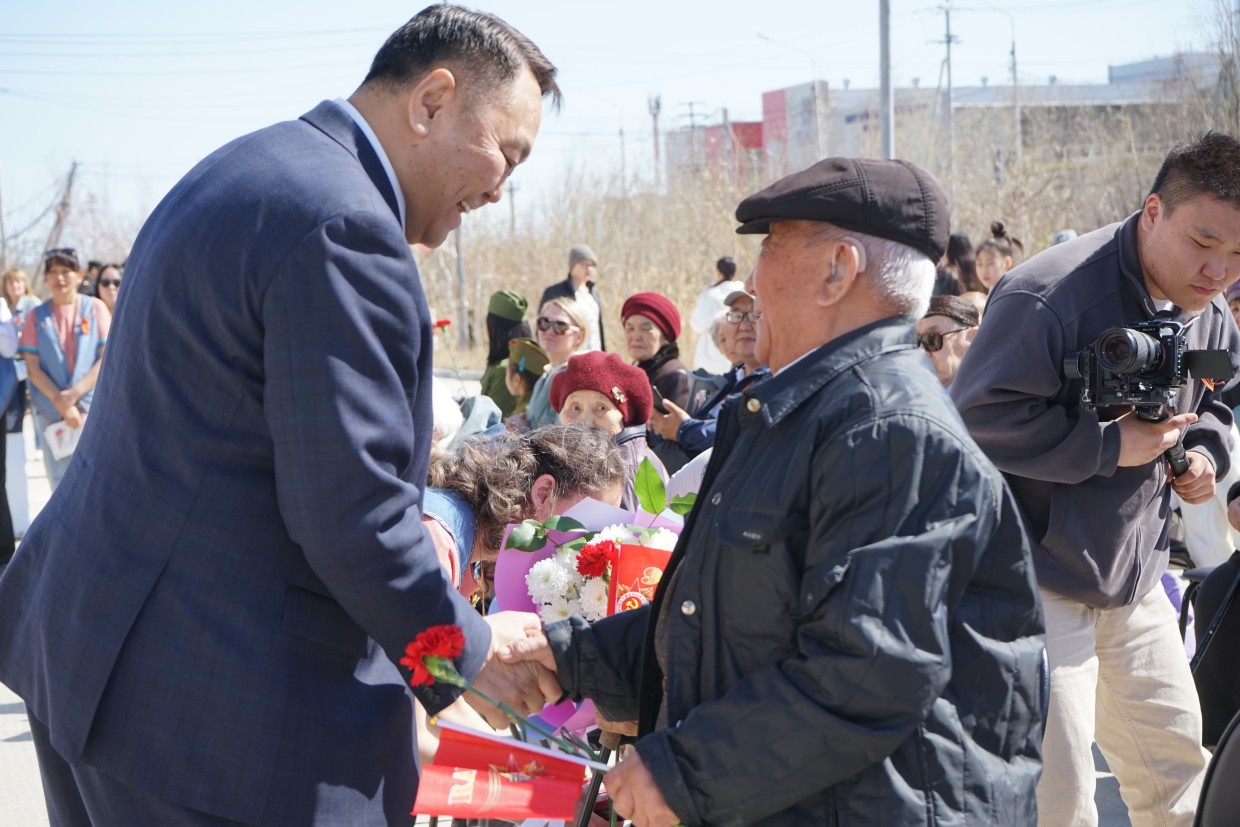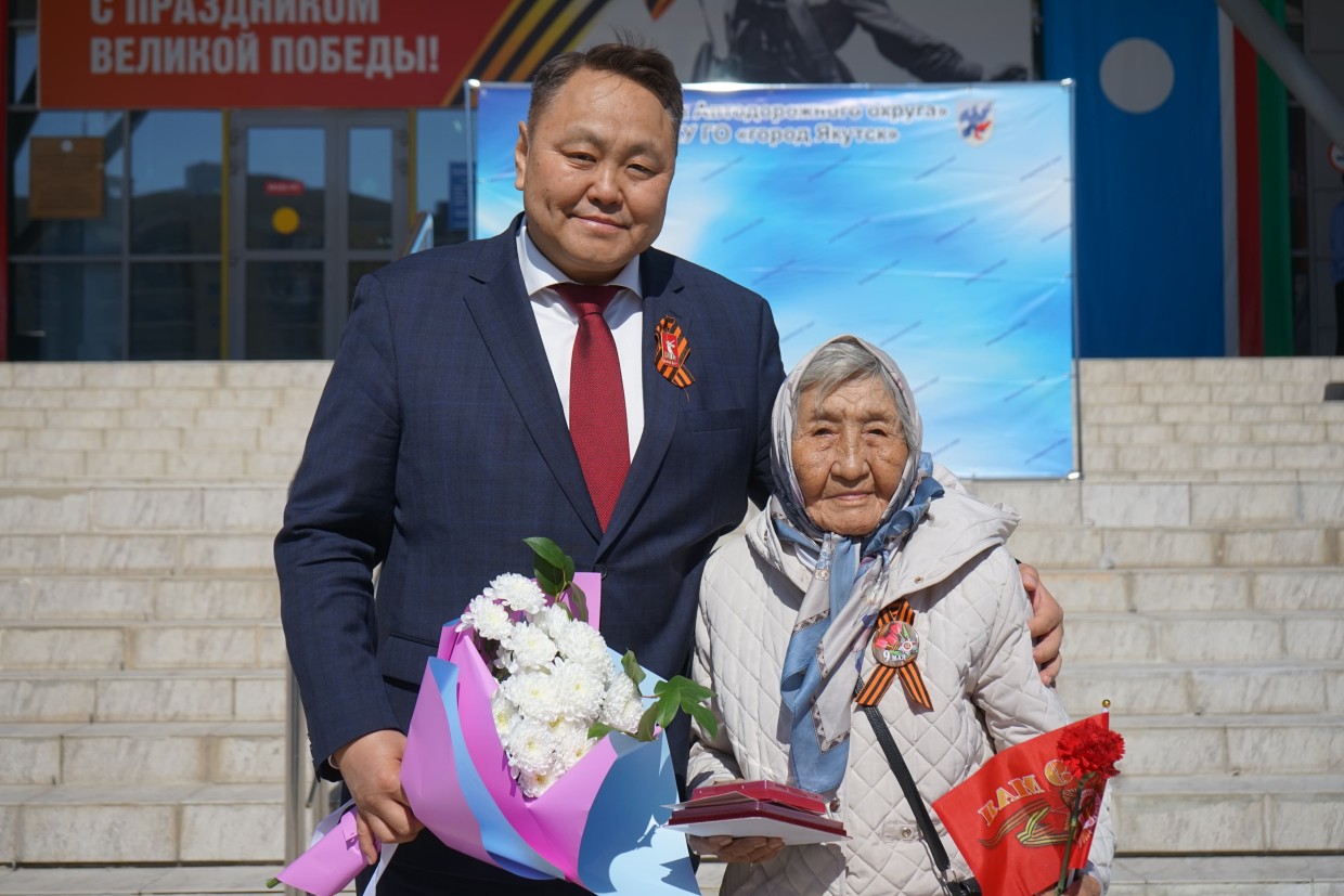 Председатель Якутской Гордумы Альберт Семенов поздравил всех присутствующих с наступающим Днем Победы и от имени Главы Республики Саха (Якутия) Айсена Николаева вручил юбилейный знак в честь 80-летия Великой Победы, а также юбилейную медаль от города Якутска - ветерану тыла Татьяне Спиридоновне Аммосовой.