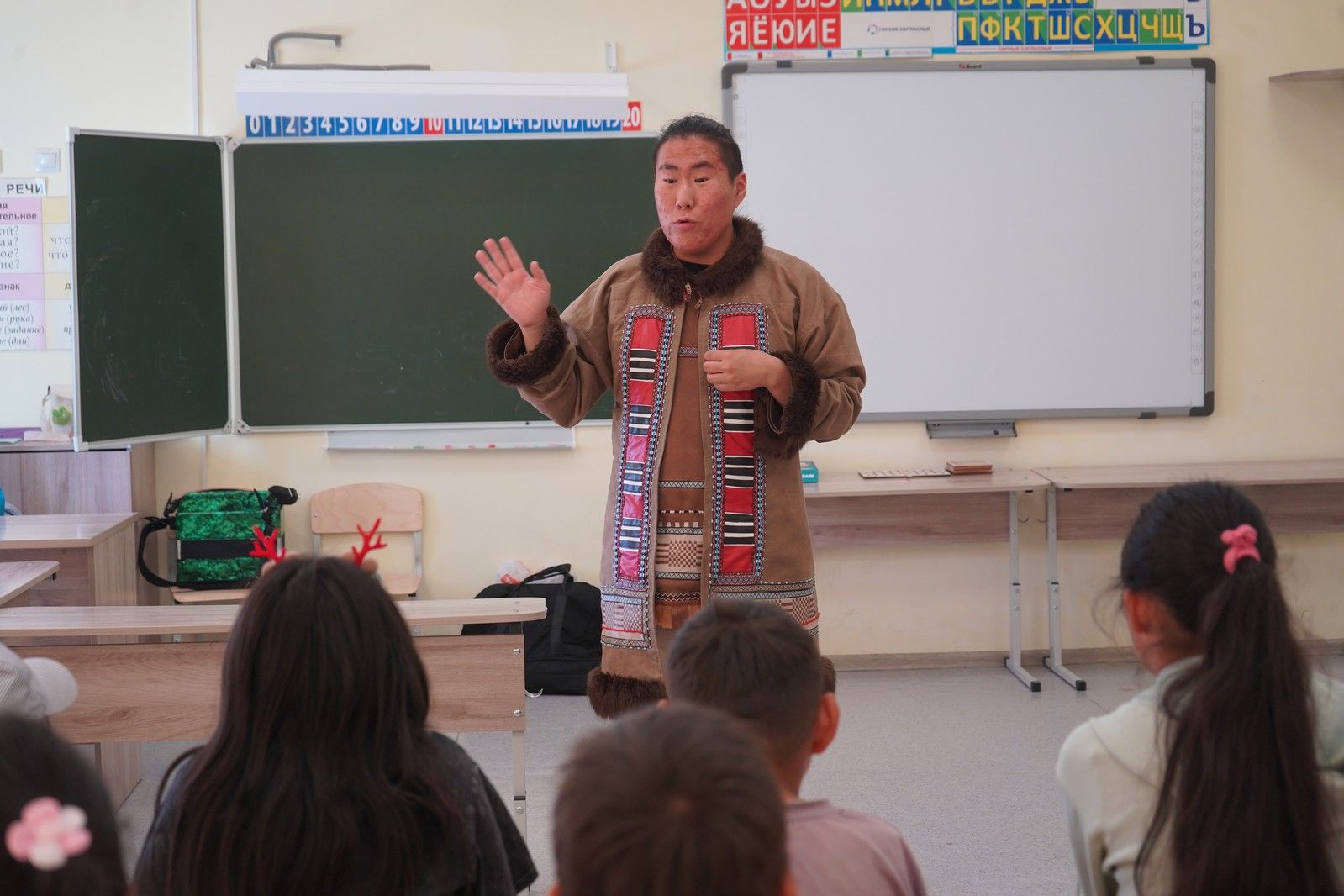 Гарпани Солинга, представитель эвенского народа, не только рассказал о жизни и обычаях эвенов, но и научил ребят танцевать сээдьэ – традиционный эвенский танец.