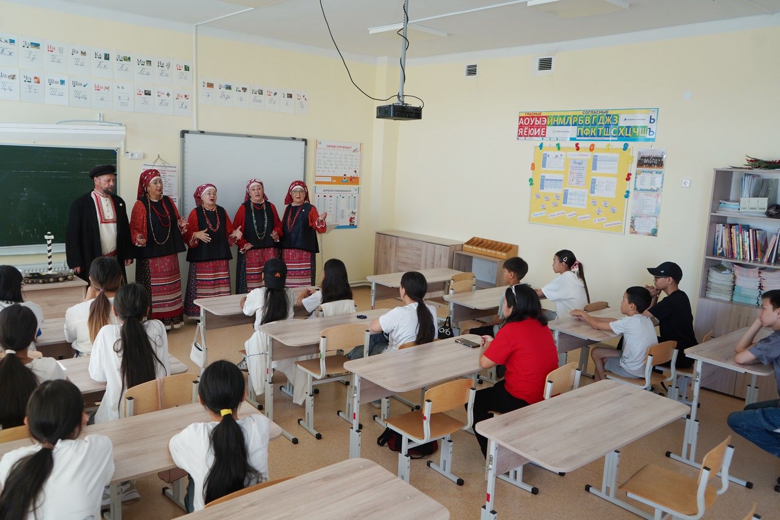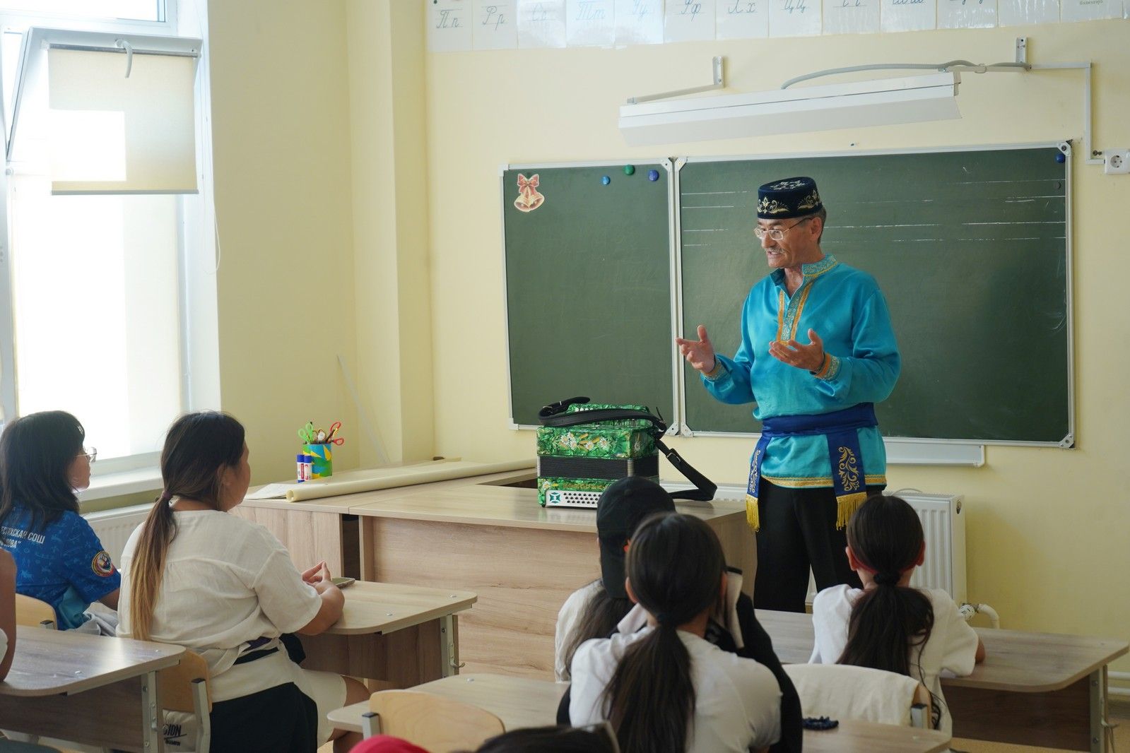 Активист татарского культурного центра РС (Я) «Туган як» Тахир Хуснутдинов познакомил школьников с татарской культурой, традициями и музыкой, рассказал о элементах традиционного костюма