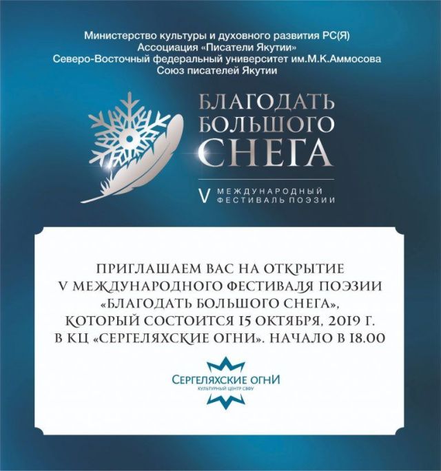 Как отмечает главный инициатор и бессменный организатор международного фестиваля, народный поэт Якутии, председатель Союза писателей Якутии Наталья Харлампьева, «Благодать большого снега” – это настоящий праздник для всех якутян — любителей поэзии. По ее словам, название фестиваля «Благодать большого снега» взято из стихотворения народного поэта Якутии Семена Данилова. Примечательно, что именно во время проведения международного фестиваля в Якутии выпадает первый снег, столь любимый и долгожданный всеми якутянами, что позволяет вынести художественный образ снега на первый план и сделать его еще одним из ярких и запоминающихся брендов республики. Союз писателей Якутии приглашает всех желающих на торжественное открытие поэтического фестиваля, которое состоится 15 октября в 18 ч в КЦ Сергеляхские огни, вход свободный.