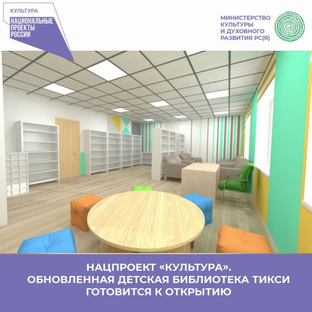 Конкурсный отбор в рамках национального проекта «Культура» на получение средств для полной модернизации по модельному стандарту Районная детская библиотека-филиал п.Тикси выиграла в 2019 г. На полученные 5 млн рублей библиотека проводит ремонт, уже закуплено оборудование, пополнен книжный фонд. Открытие намечено на конец сентября – начало октября.