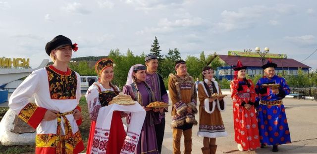 Теплоход «Восход» причалил к дебаркадеру, где уже играла музыка, большая и яркая группа в национальных костюмах встречала гостей. Каждая группа преподносила национальное угощение: клуб «Осуохай» — оладушки, татары – чак-чак, эвенки – олобишки с рыбой, буряты — боовы и, конечно же, традиционный каравай – вокальный ансамбль «Ивушки» с русской величальной песней. А песня в исполнении казачьего ансамбля «Селяне» села Олекминское заставила пуститься в пляс и встречающих, и гостей.