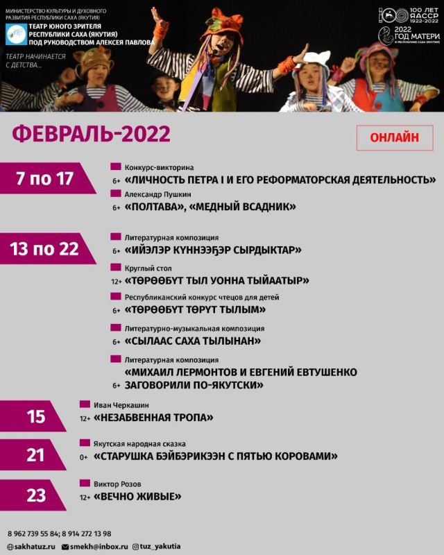 Всех наших любимых зрителей приглашаем к просмотру наших мероприятий, а так же вы можете принять активное участие в конкурсах, викторинах. Более подробную информацию можно посмотреть на официальном сайте театра http://sakhatuz.ru/ и на странице инстаграмм tuz_yakutia.