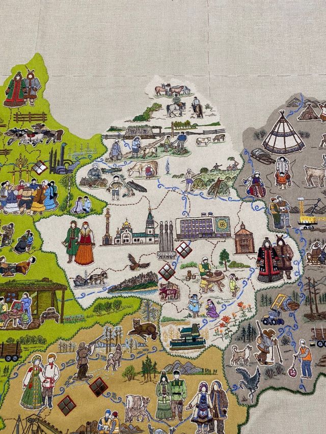 Работа над образами и сюжетами на вышитой карте предполагает миниатюрные изображения, среди которых самыми большими по высоте являются фигуры людей в национальной одежде – 8 см. Все остальные фигуры и того меньше. При этом предварительно все картинки по сюжету были нарисованы еще одним членом творческой группы – художником проекта Нюргуяной Игнатьевой. Достоверность информационной части всех образов, сюжетов и композиций координировал архитектор Сергей Миронов.