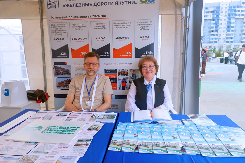 «Железные дороги Якутии» ведут профориентационную деятельность и активно сотрудничают с многими учебными заведениями – школами, техникумами, университетами. С момента основания одним из главных партнёров компании является Дальневосточный государственный университет путей сообщения. На ярмарке вуз представлял директор Института тяги и подвижного состава ДВГУПС Андрей Евгеньевич Стецюк, специально приехавший на мероприятие из Хабаровска. Он отметил, что ДВГУПС уже не первый год активно участвует в этой ярмарке-выставке.