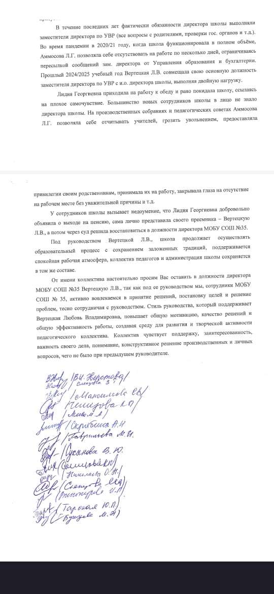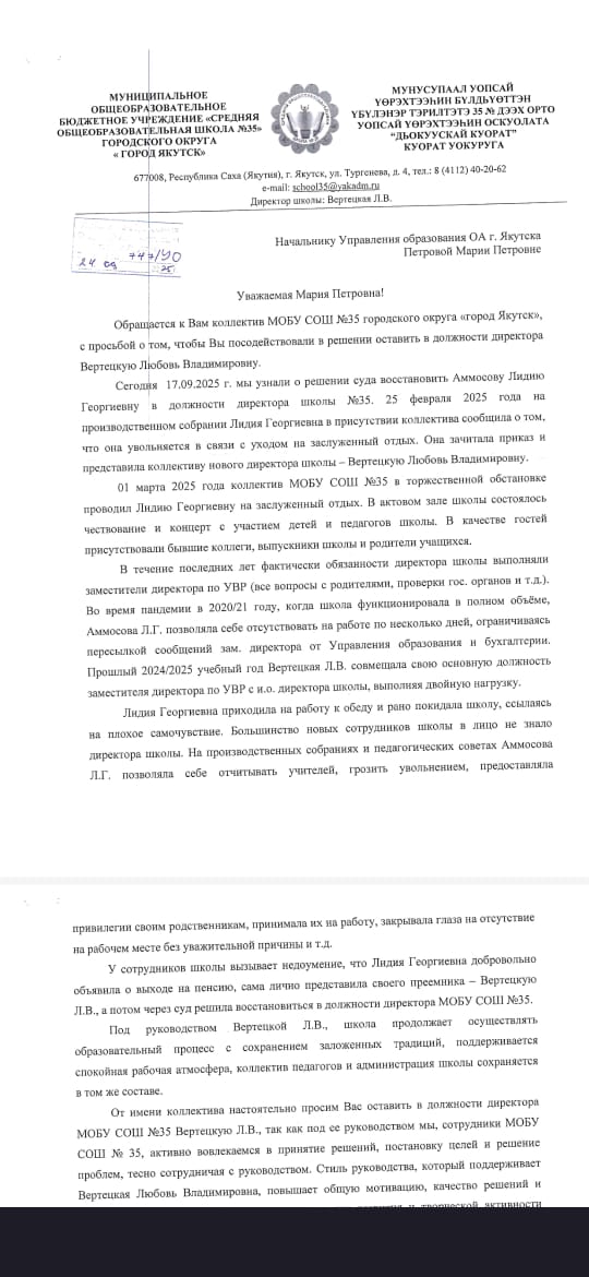 Коллектив МОБУ СОШ #35 города обратился с обращением о несогласии восстановления на работу прежнего директора Аммосовой Лидии Георгиевны и просят оставить в должности директора Вертецкую Любовь Владимировну.
