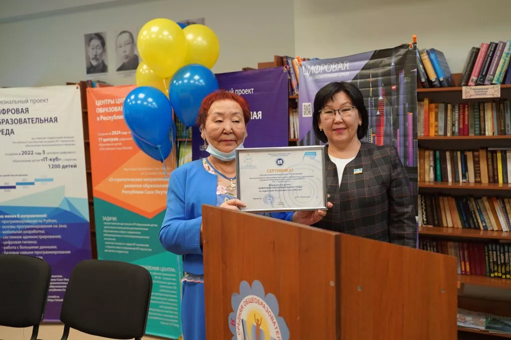 На фото Управления образования Якутска от 2021 года министр образования и науки Республики Саха (Якутия) Ирина Павловна Любимова и директор школы Лидия Георгиевна Аммосова.