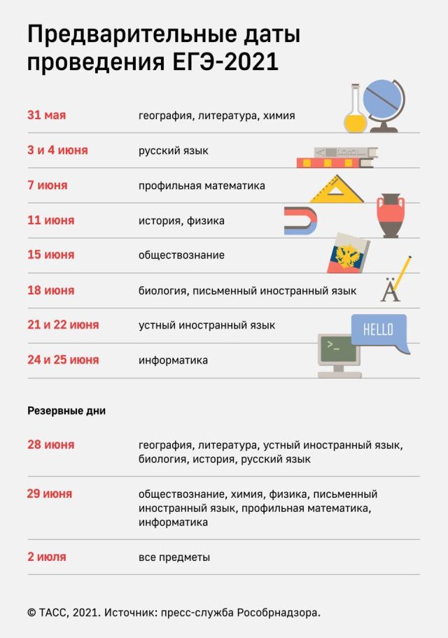Резервные дни для сдачи ЕГЭ предполагается назначить на 28, 29 июня и 2 июля, в дополнительный период экзамены пройдут 12, 13 и 14 июля и в резервный день — 17 июля.