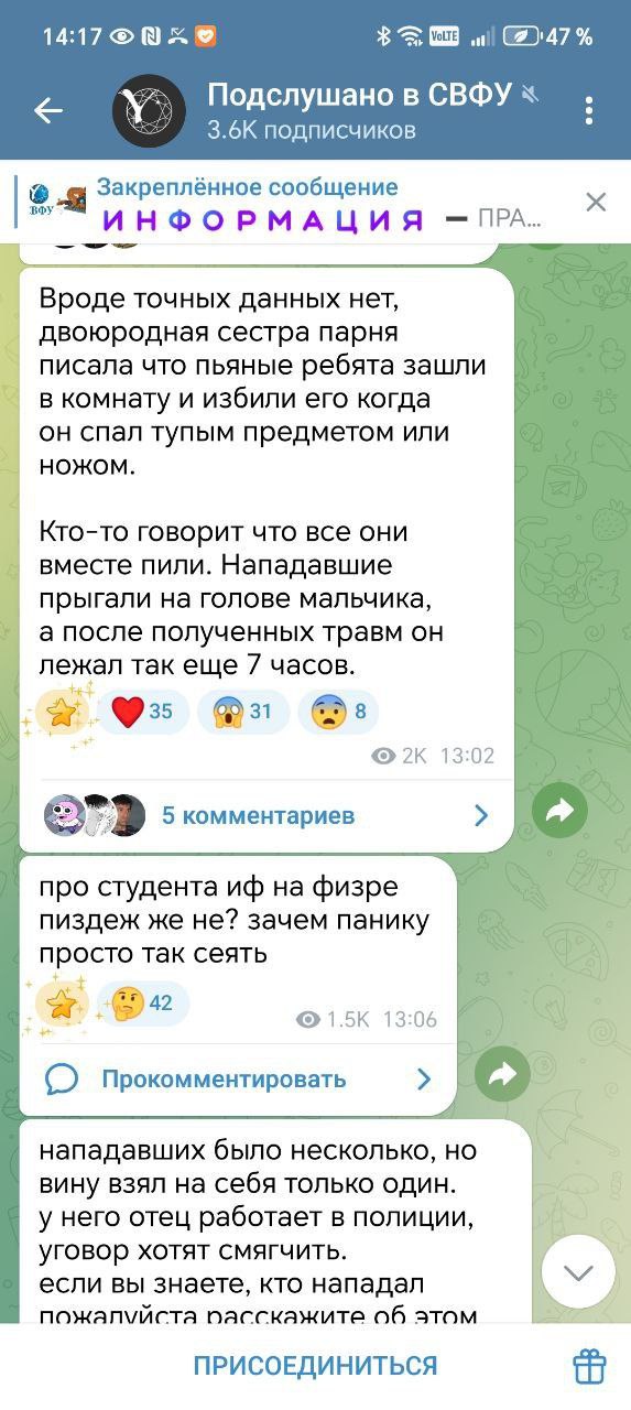 Также со слов источника, телесные повреждения Петру нанес другой студент. Жестокое избиение произошло в общежитии.