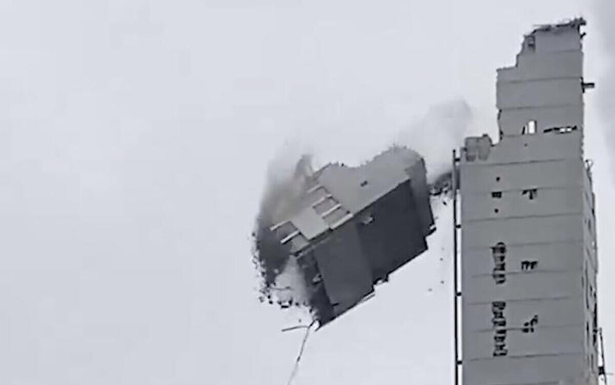 Опорная колонна обрушилась на стройплощадке, однако осколки при падении разлетелись и повредили машины, окна ближайших домов.