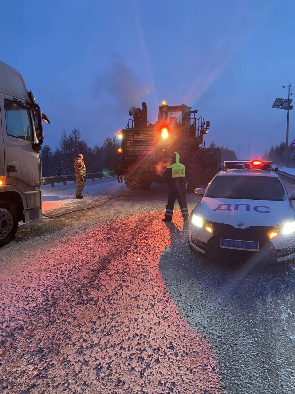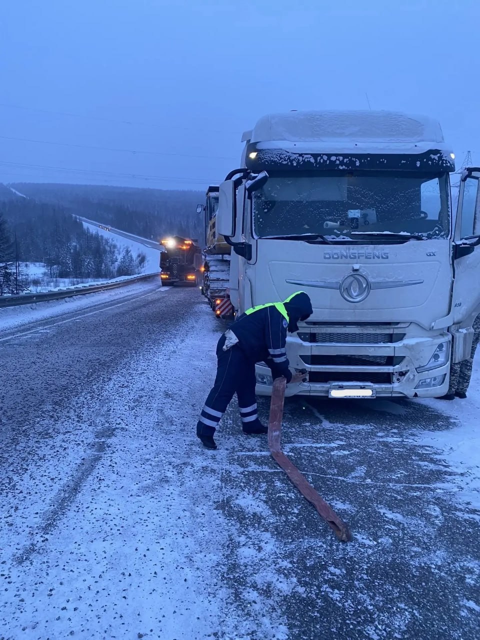 Инспекторы оперативно прибыли на место. Они предложили водителю укрытие, горячее питье и питание. При содействии ООО «УК «Колмар»» неисправный грузовик был отбуксирован на безопасную стоянку.