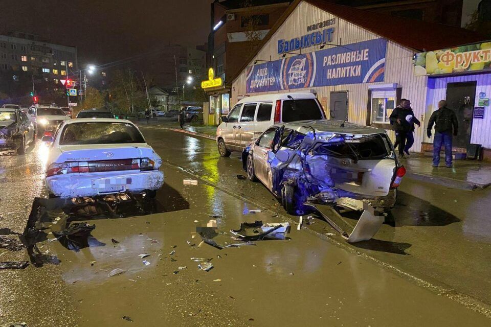 52-летний водитель «Тойоты Витц» на скорости совершил наезд на впереди стоящую «Тойоту Филдер». Затем началась цепная реакция. «Филдер» наехал на «Тойоту Короллу», которая врезалась на припаркованные «Тойоту Таун Айс» и «Тойоту Витц». После «Филдер» совершил касательное столкновение с автомашиной «Тойота Королла», далее на полосе встречного движения — с «Ниссан Марч».