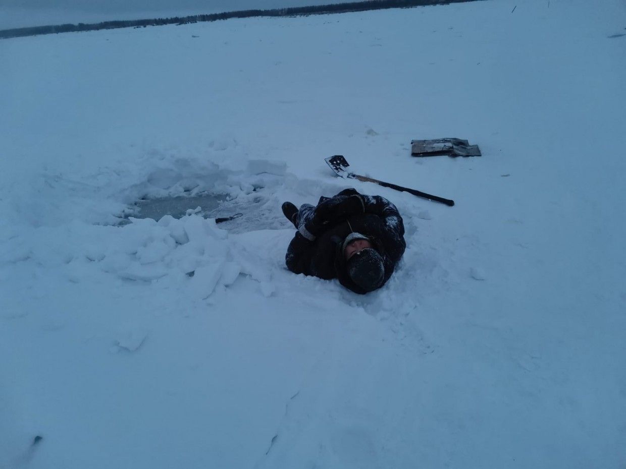 Мужчину эвакуировали на берег, передали врачам службы 03. Предположительно, мужчина вышел на рыбалку и упал при проделывании лунки, получил порез на правой стороне тела, имеет признаки инсульта.