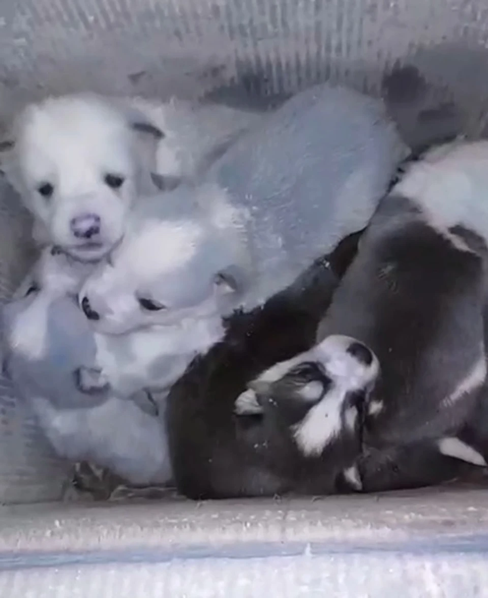 Внутри оказывается целый выводок щенят. Кто-то выкинул их на мороз, но при этом поставил коробку ближе к теплотрассе. Естественно, что это не спасло бы им жизнь, а максимум продлило мучения. Бедные животные грели друг друга своими телами.