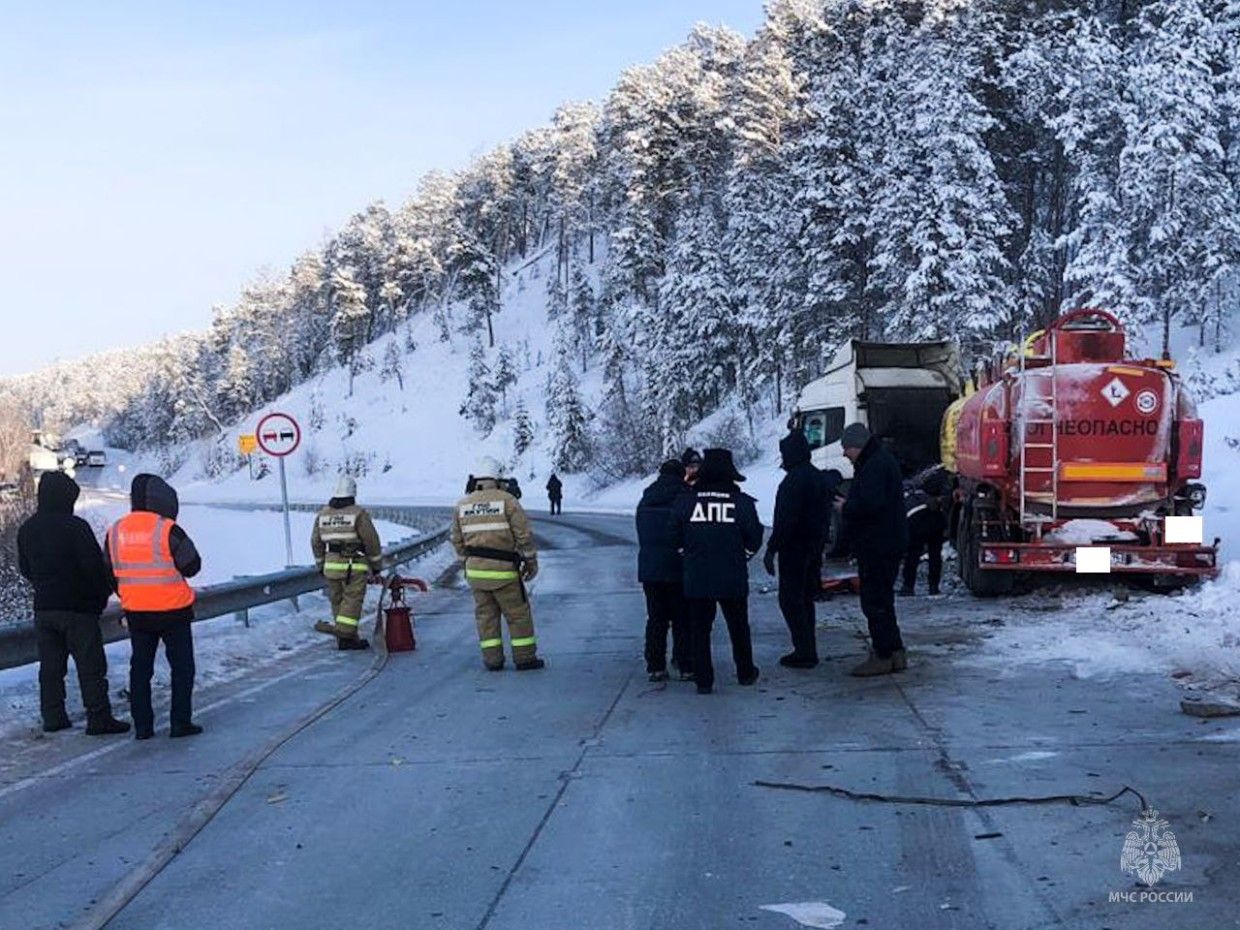"В результате ДТП повреждена емкость бензовоза, наблюдается утечка нефтепродуктов. Сейчас производится перекачка топлива. Количество устанавливается. Пострадавших нет", - сообщает пресс-служба МЧС Якутии.