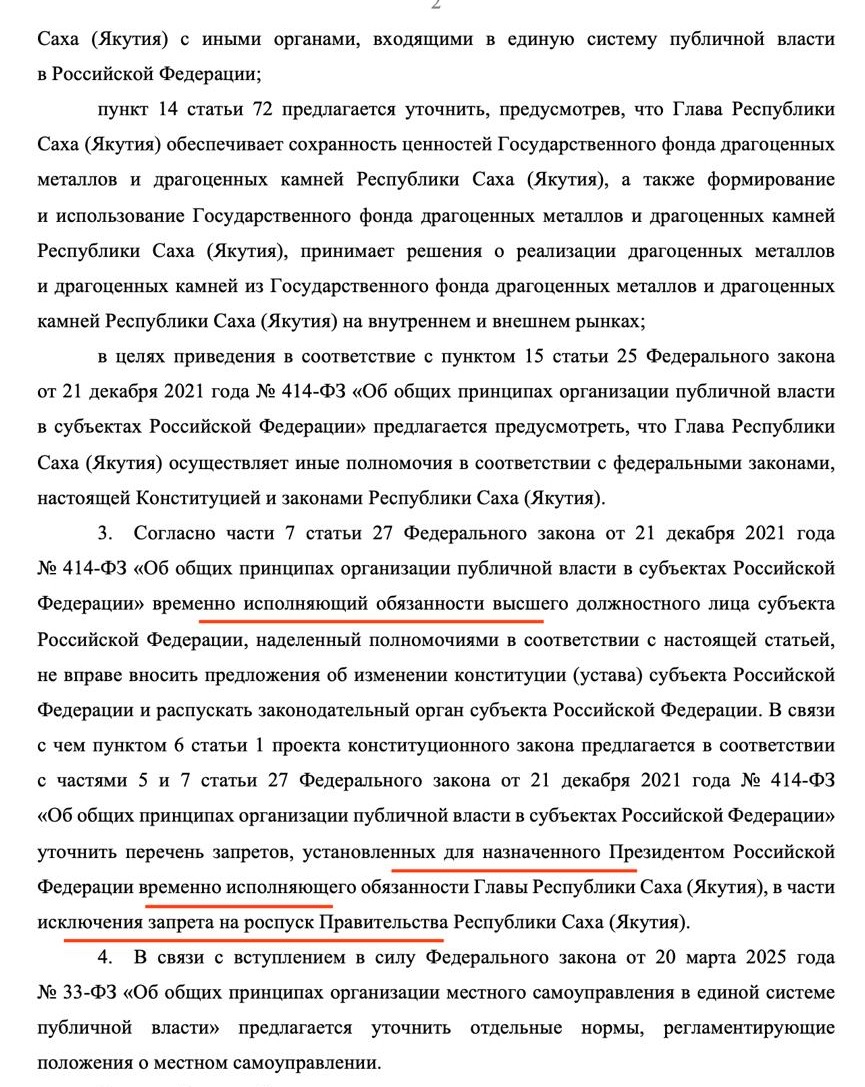 Сообщается, что глава Якутии 26 сентября предложил внести ряд изменений в Конституцию РС(Я). В частности, действующий в статье 76 Конституции РС(Я) запрет Врио главе на роспуск правительства РС(Я) предложено отменить, то есть разрешить Врио главе республики, назначенному президентом РФ, отправить правительство в досрочную отставку.