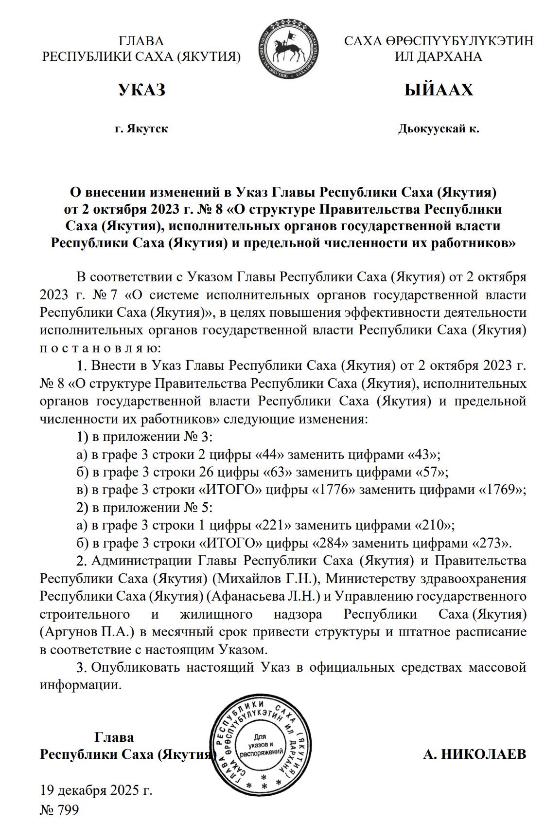 ✔️В Управлении государственного строительного и жилищного надзора РС(Я) (Аргунов П.А.) минус 6-ть должностей.