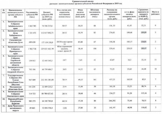 Депутат приводит сравнительную таблицу расходов региональных законодательных органов.
