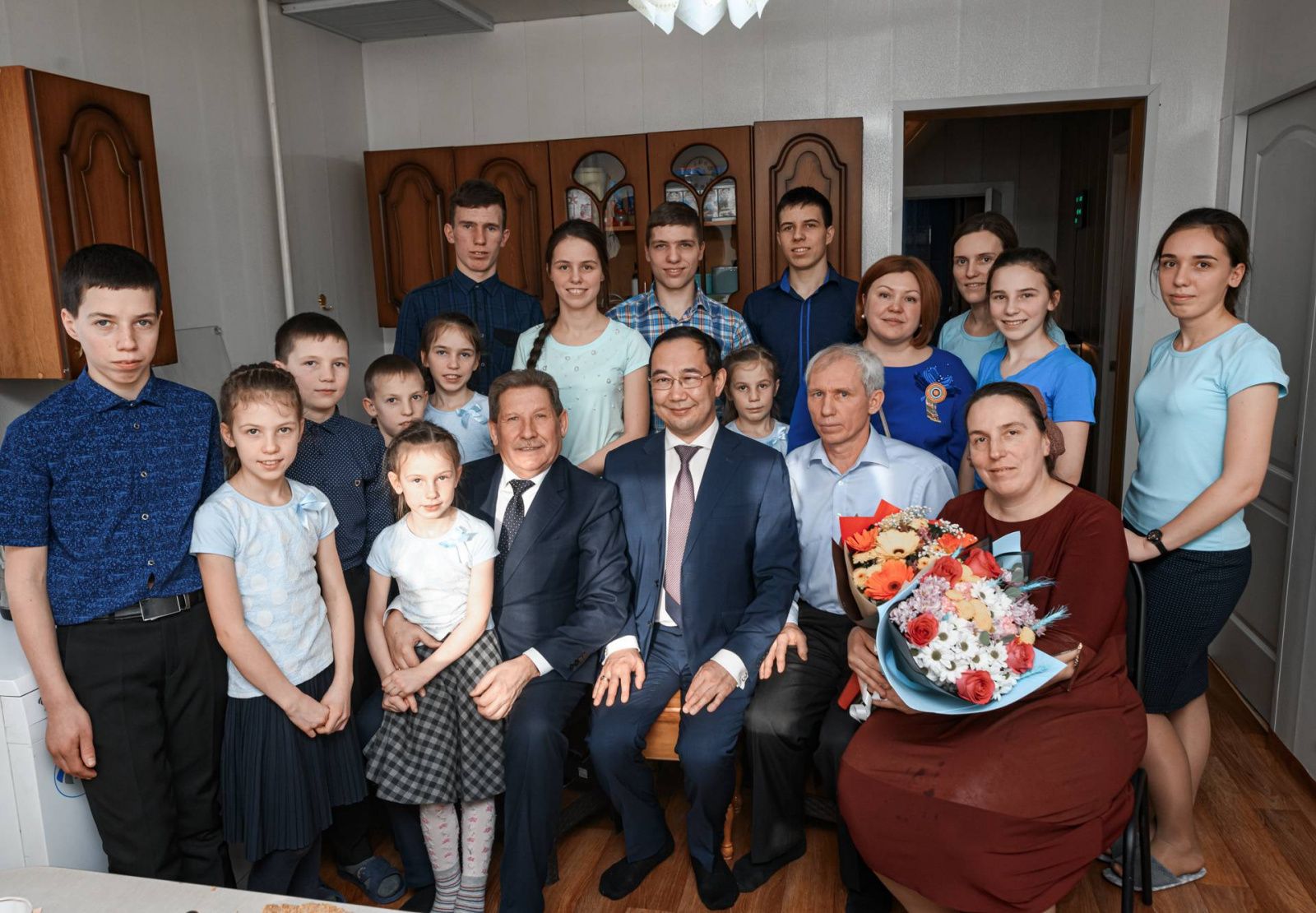 Айсен Николаев поинтересовался у детей об учебе. Две старшие дочери — студентки Нерюнгринского медколледжа, неоднократные победители, призеры региональных, российских предметных олимпиад. Младшие учатся в школе на пятерки и четверки, четверо детей — дошкольники. Каждый ребенок играет на музыкальном инструменте, все вместе они составляют большой семейный оркестр.