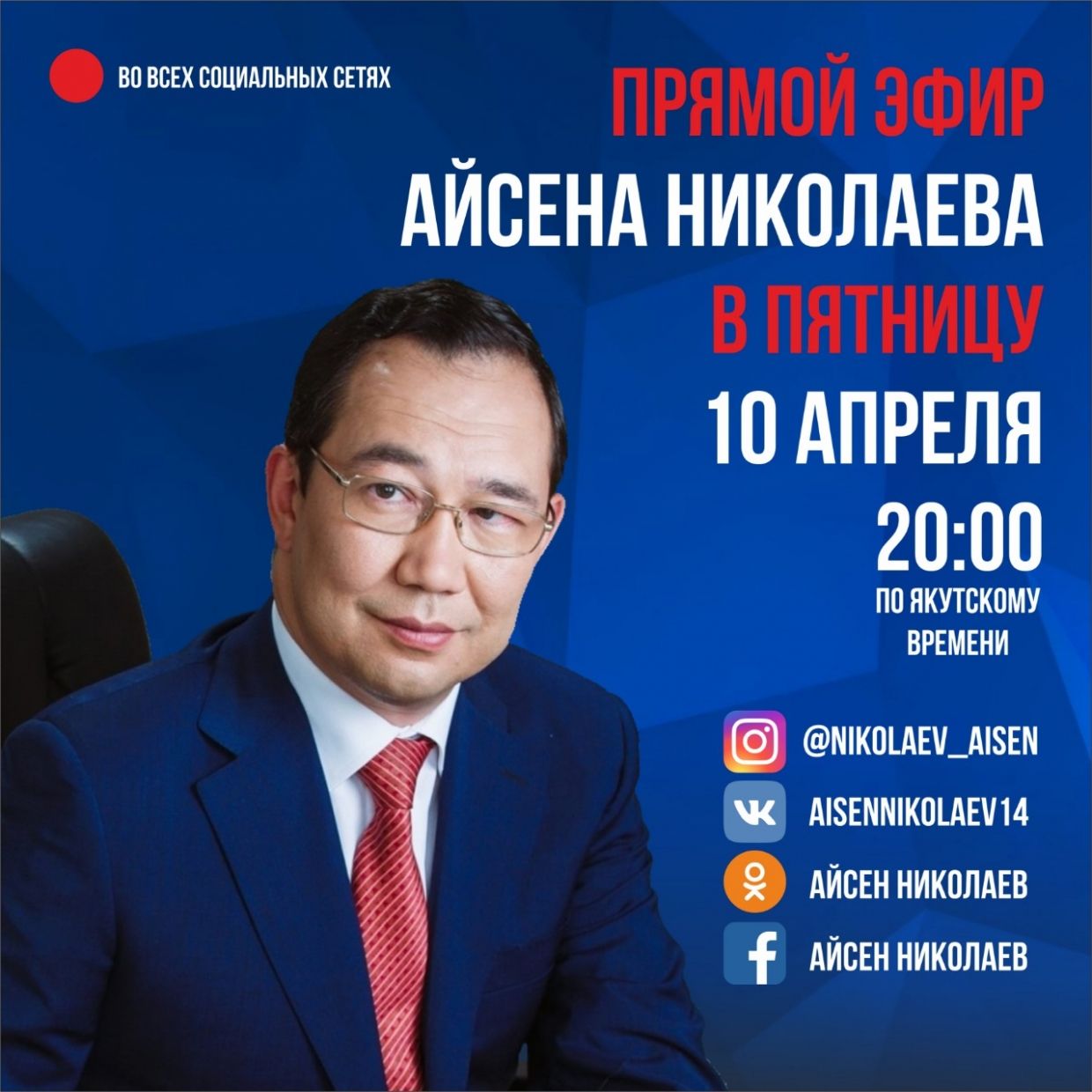 Сегодня, 10 апреля, в 20:00 часов по якутскому времени состоится прямой эфир Главы Якутии Айсена Николаева в четырёх социальных сетях: «ВКонтакте», «Instagram», «Facebook» и «Одноклассники».