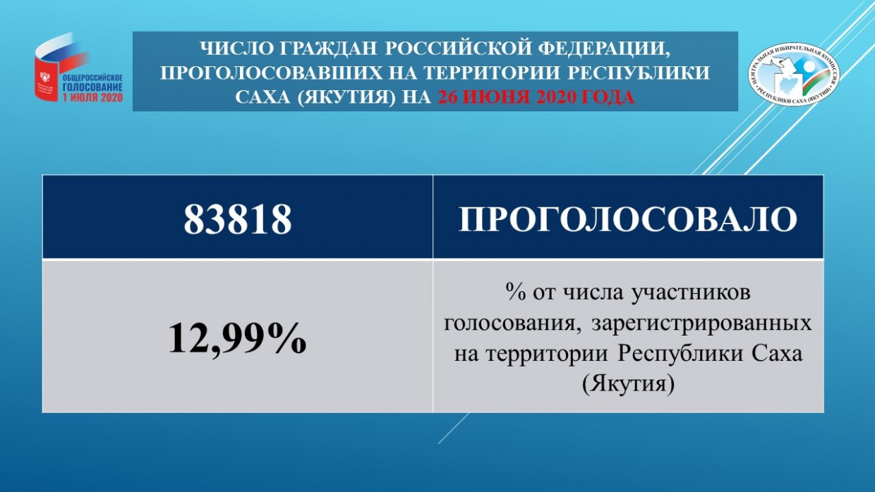 В течение первых двух дней Общероссийского голосования по вопросу одобрения изменений в Конституцию РФ, 25 и 26 июня 2020 года, получили бюллетени для голосования 83 818 участника голосования, что составляет 12.99% от общего количества граждан, включенных в списки участников голосования на территории Республики Саха (Якутия), сообщает Центральная избирательная комиссия Республики Саха (Якутия).