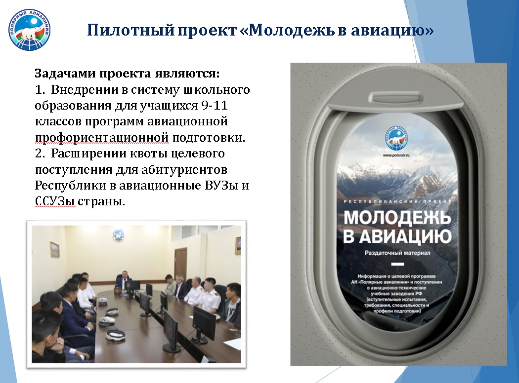 Сегодня в рамках проекта «Молодежь в авиацию» в систему школьного образования для учащихся 9-11 классов внедрены программы авиационной профориентационной подготовки, расширены квоты целевого поступления для абитуриентов из Якутии в авиационные вузы и ссузы страны.