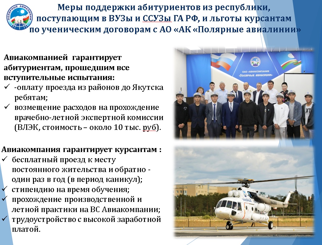 Авиакомпанией «Полярные авиалинии» оказывается содействие абитуриентам из республики, поступающим в вузы и ссузы гражданской авиации РФ: это оплата проезда из районов до Якутска прошедшим все вступительные испытания, также возмещение расходов на 10 тысяч рублей на прохождение врачебно-летной экспертной комиссии (ВЛЭК).