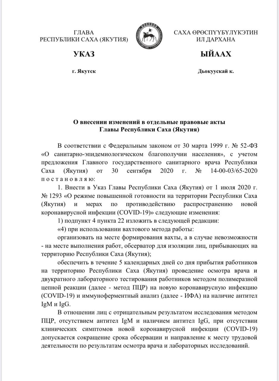 Соответствующий указ 1 октября подписал глава Якутии Айсен Николаев.
