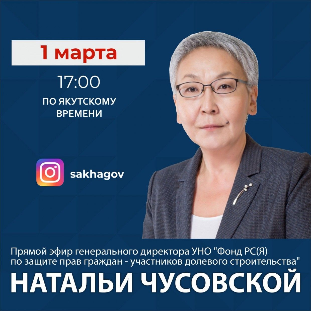 Генеральный директор УНО «Фонд РС(Я) по защите прав граждан - участников долевого строительства» Наталья Гаврильевна Чусовская проведет 1 марта 2021 г. прямой эфир на официальной странице Администрации Главы и Правительства Республики Саха (Якутия) в социальной сети Instagram.