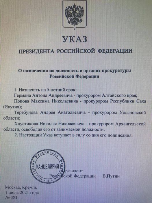 1 июля президент России подписал указ, которым Максим Попов назначен прокурором Республики Саха (Якутия) на пятилетний срок.