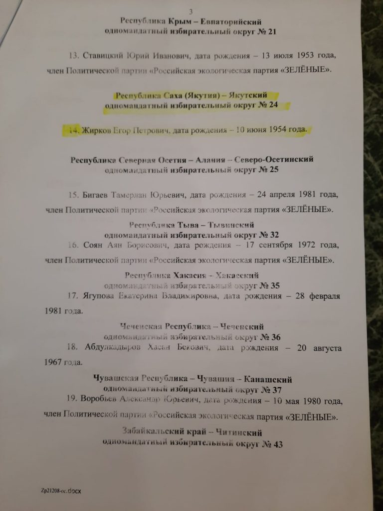 Согласно представленным партией спискам, по одномандатному избирательному округу № 24 – Республика Саха (Якутия) выдвинут ЖИРКОВ Егор Петрович, известный политик и государственный деятель.
